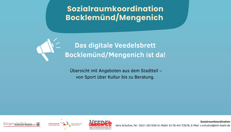 Du suchst nach einem Ort, an dem du alle Angebote, Infos und Veranstaltungen aus Bocklemünd/Mengenich auf einen Blick findest?Dann bist du hier genau richtig! Das Veedelsbrett zeigt dir, was im Veedel los ist – aktuell, übersichtlich ...
