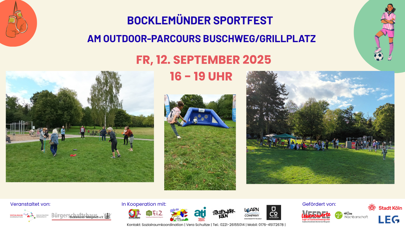 Am 12. September 2025 wurde die große Wiese am Buschweg zur Sportarena: Beim Bocklemünder Sportfest drehte sich alles um Bewegung, Begegnung und Miteinander. Unter dem Motto „Gemeinsam aktiv in Bocklemünd!“ kamen rund 60 Kinder, Jugendliche und Erwachsene zusammen, um sich sportlich auszuprobieren und gemeinsam einen fröhlichen Nachmittag zu verbringen.