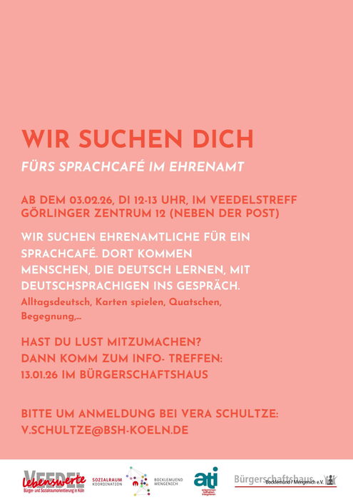 Ab dem 03.02.26 startet das Sprachcafé in Bocklemünd. Beim Sprachcafé tauschen sich Menschen, die Deutsch lernen, in entspannter Atmosphäre mit Personen aus, die gut Deutsch sprechen oder Deutsch als Muttersprache haben. Gemeinsam kann man sich austauschen, erzählen oder auch Spiele spielen. Haben Sie Interesse, sich ehrenamtlich zu engagieren? Dann melden Sie sich bei Vera Schultze (v.schultze@bsh-koeln.de). Das Sprachcafé wird immer dienstags von 12-13 Uhr im Veedelstreff (Görlinger Zentrum 12 neben der Post) stattfinden.